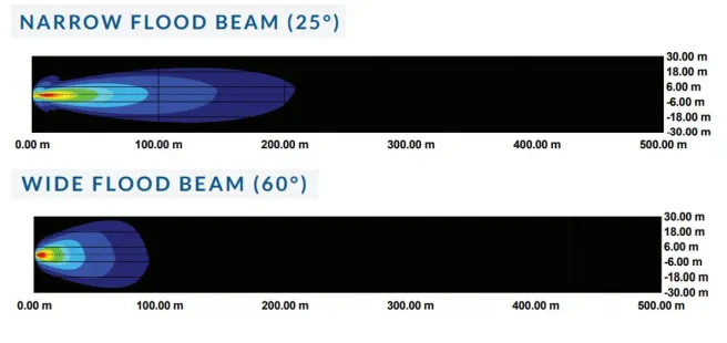 In the context of choosing the proper deck light, it simply becomes a question of geometry and determining which beam angle will result in the fixture throwing the most light where you need it. Two light fixtures with the exact same intensity can throw light in significantly different patterns depending on the beam angle. This is demonstrated in the graphic below, which shows the light pattern of Imtra’s Offshore 12-LED Deck Light in both a 25° beam-angle fixture, and a 60° beam-angle fixture. As you can see, just the 35° difference in beam angles results in a drastically different pattern of light, with one throwing visible light over 100 meters further in one direction.