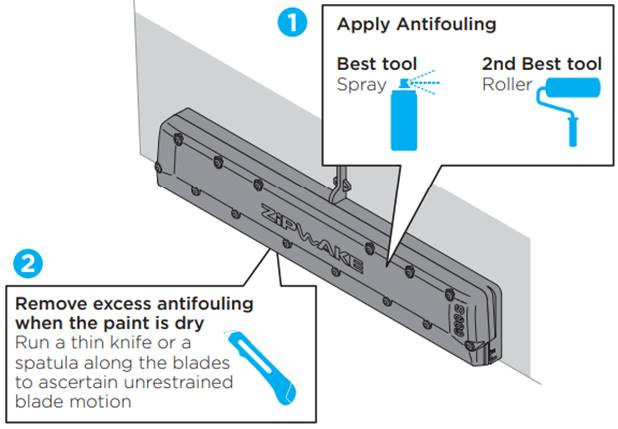 With blades retracted, treat the interceptors with anti-fouling  paint being careful not to get any paint inside the blade opening or anywhere on the face of the blade. Leave the blades untreated.